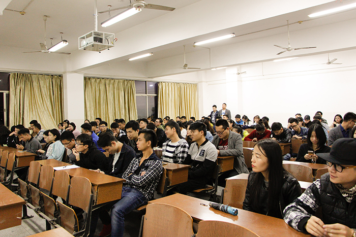 为响应校团委“大众创业,万众创新”的号召,2016年10月26日晚上,关于就业与创业的”创业大讲堂“讲座”在必赢76net线路官网五教602隆重举行。本次讲座由北京尚学堂科技有限公司CEO吴杰主讲,必赢76net线路官网全体大四同学共同参加。